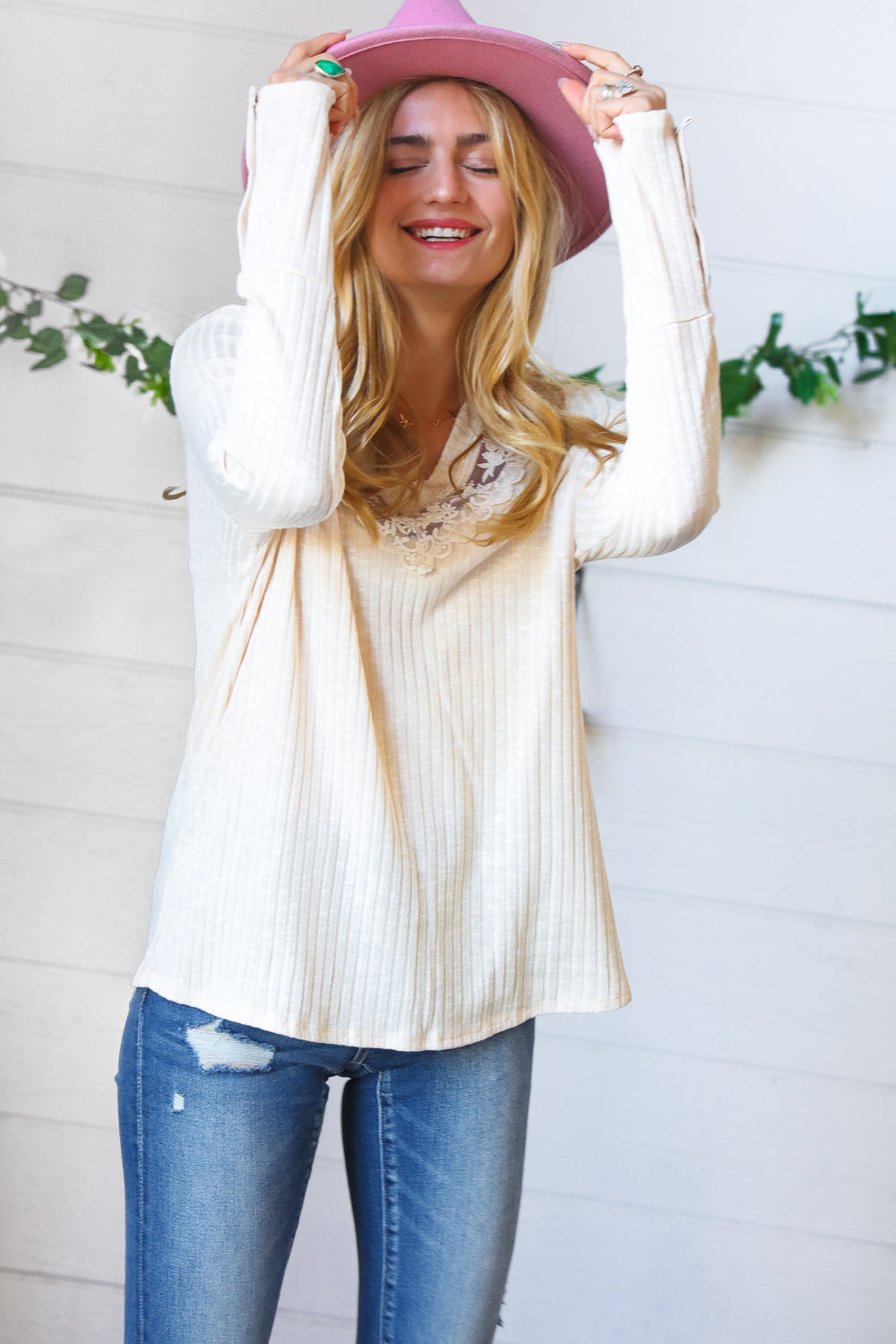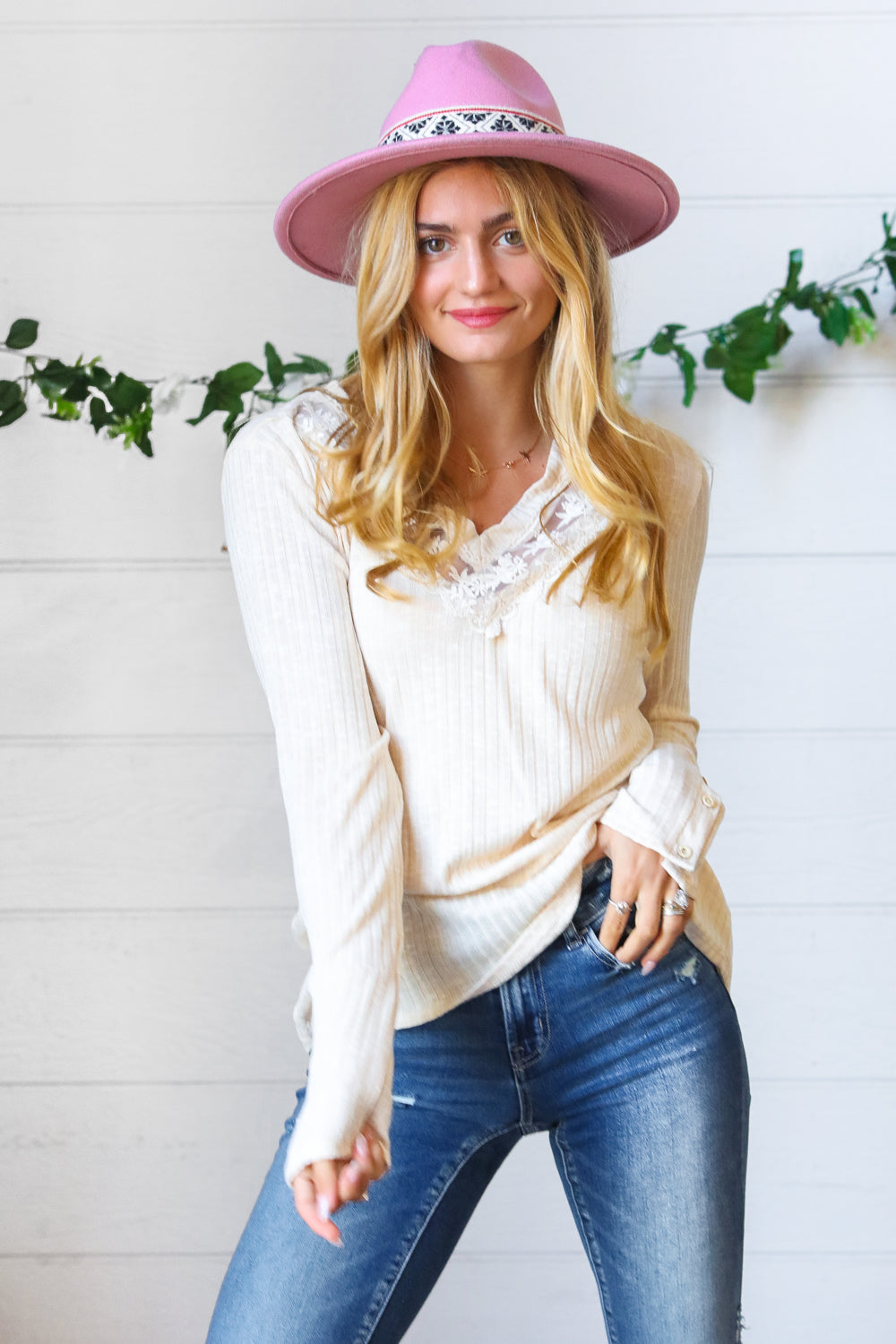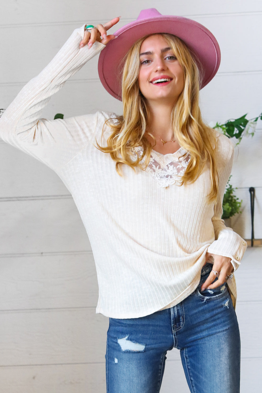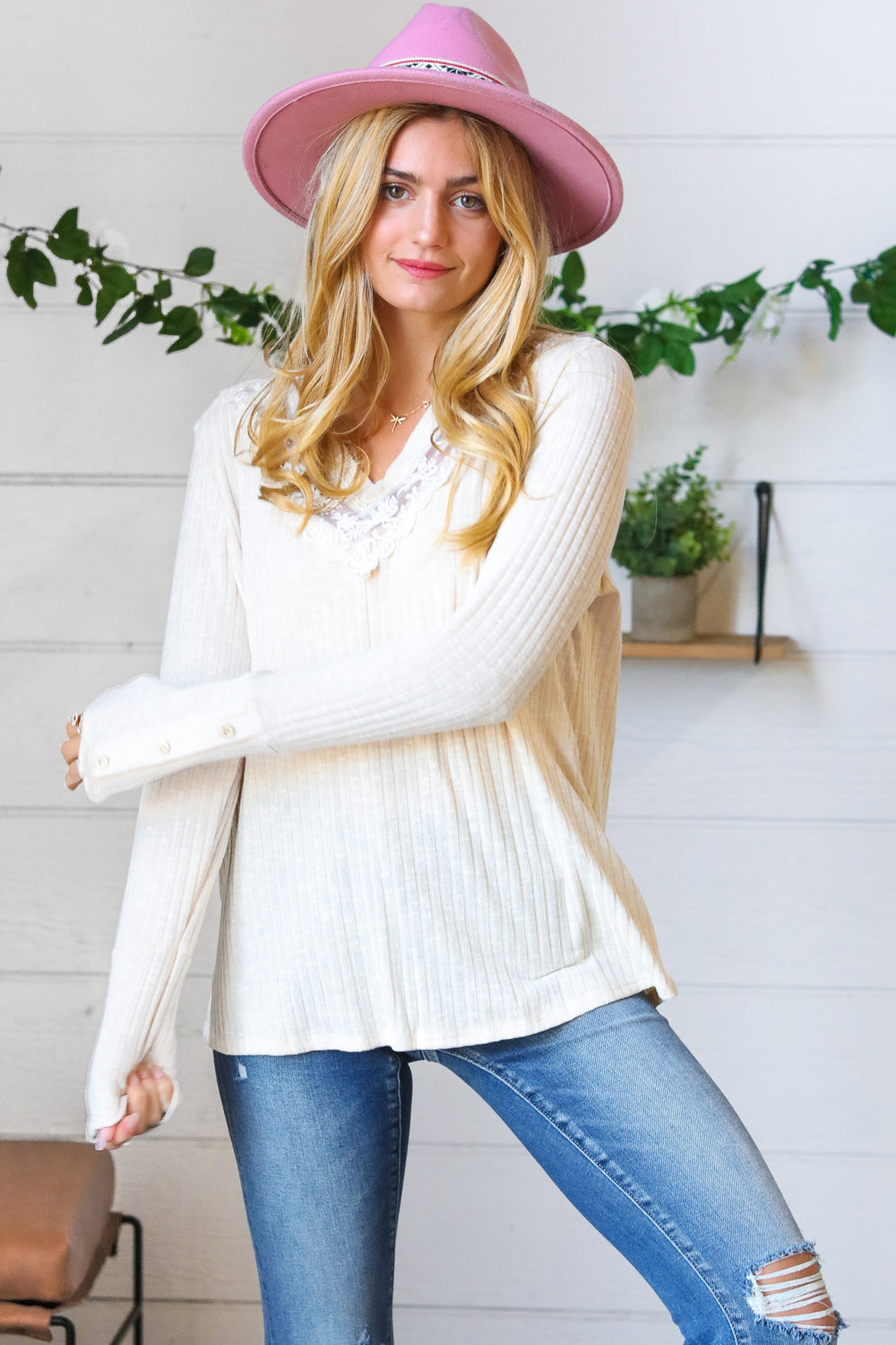 Rib Knit + Crochet Lace V Neck + Button Capped Sleeves