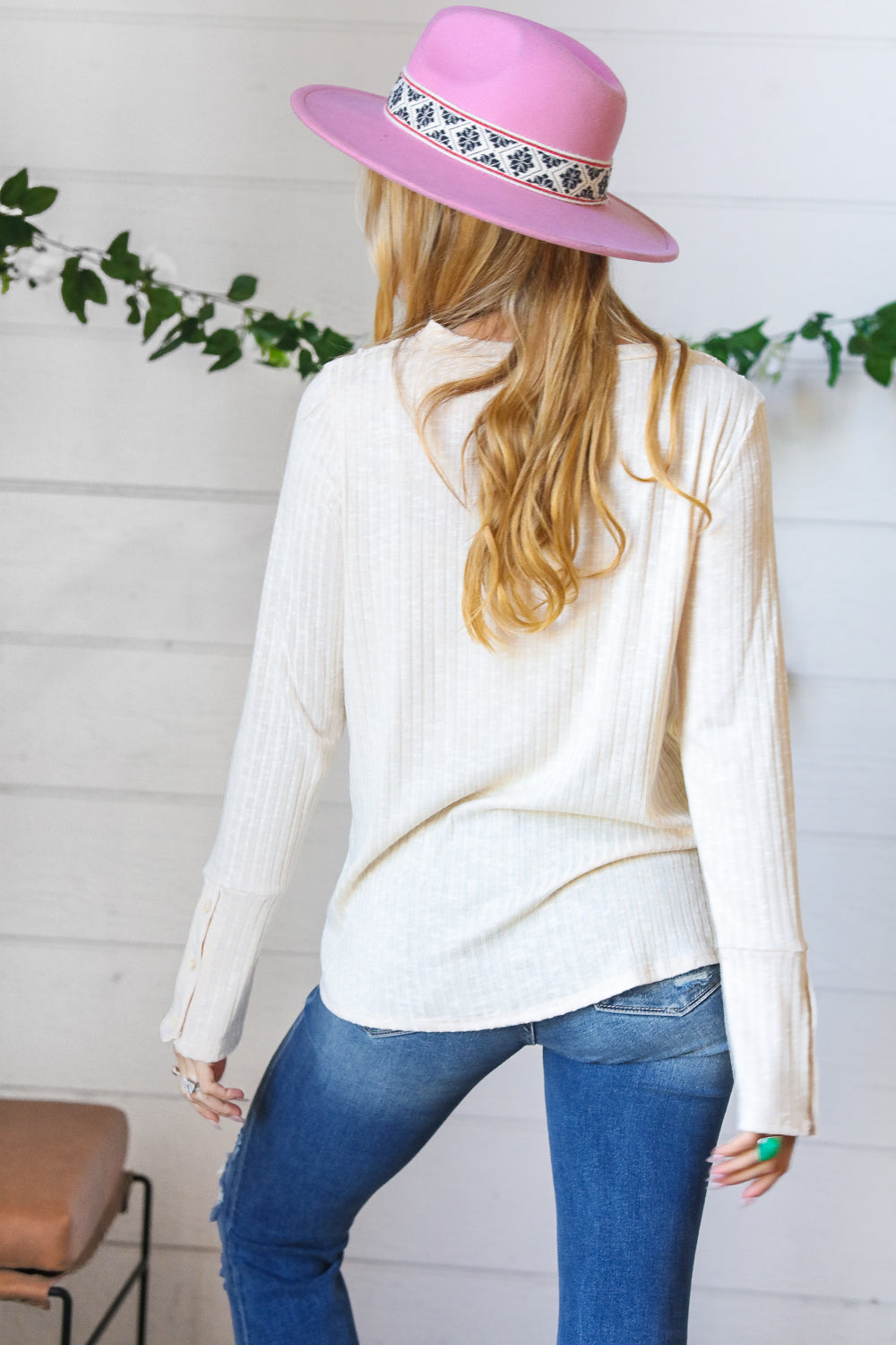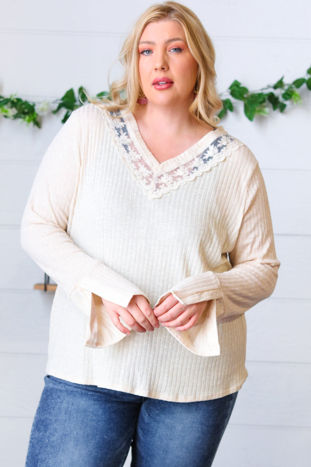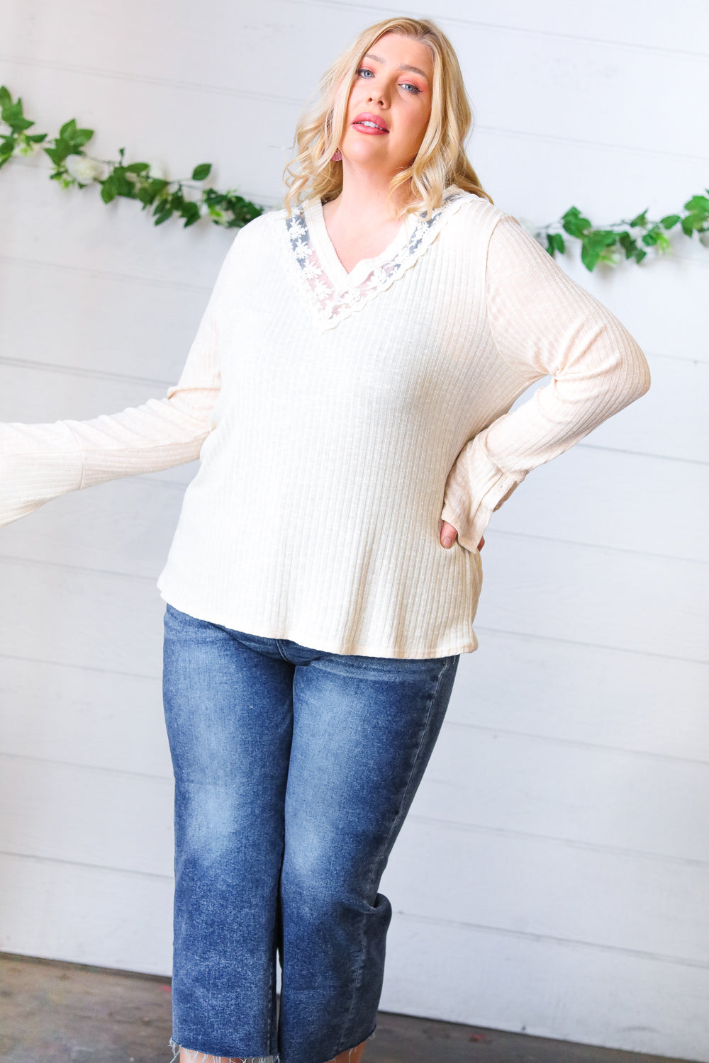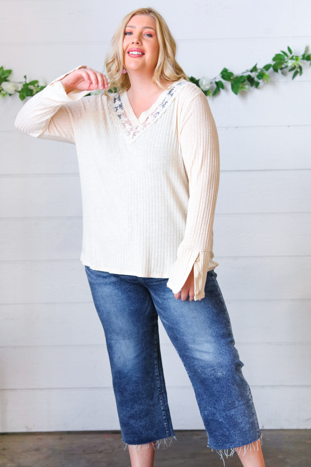 Rib Knit + Crochet Lace V Neck + Button Capped Sleeves
