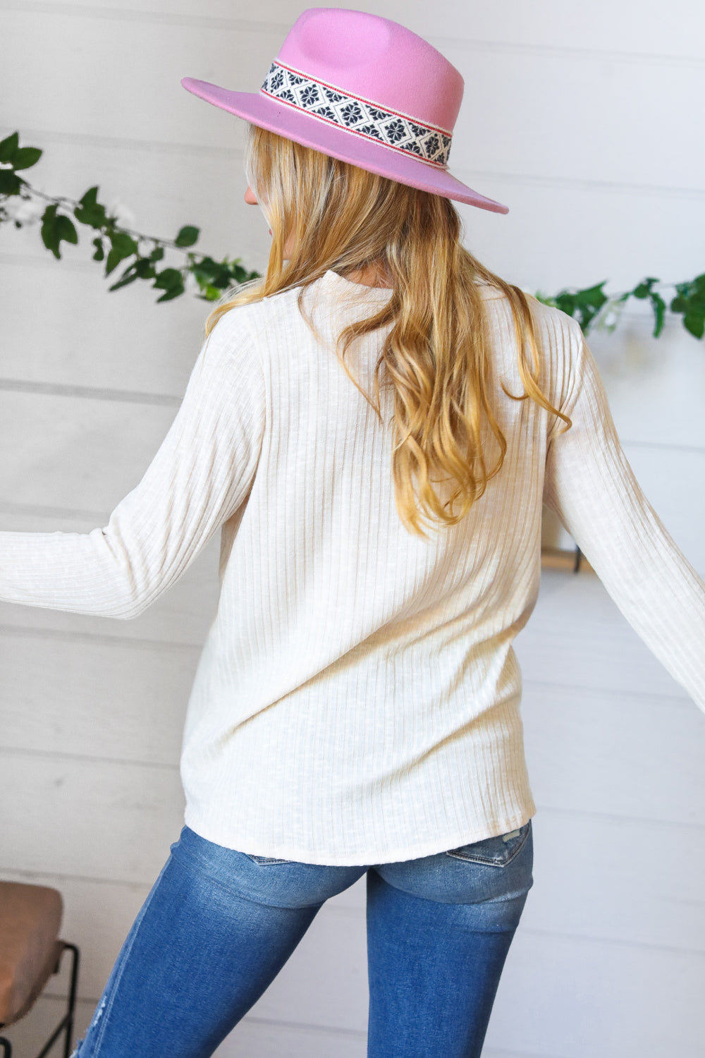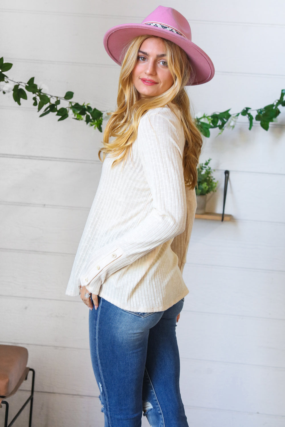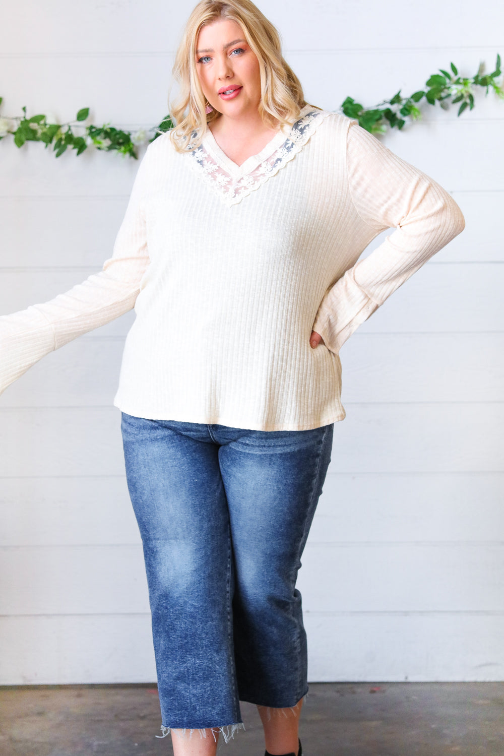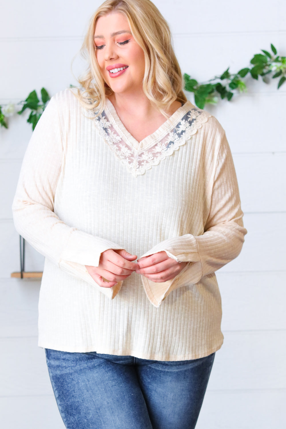 Rib Knit + Crochet Lace V Neck + Button Capped Sleeves