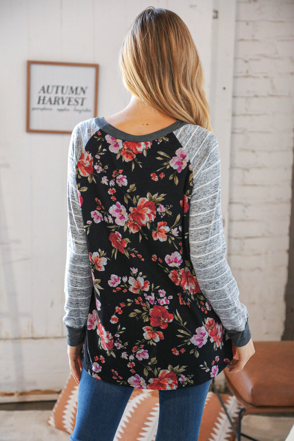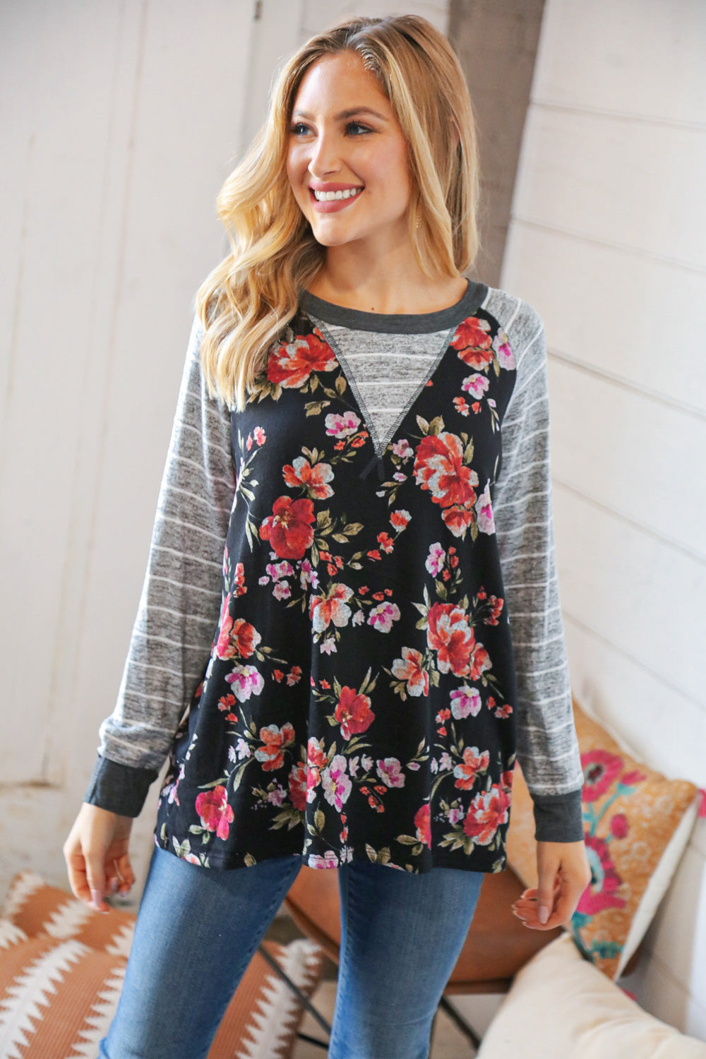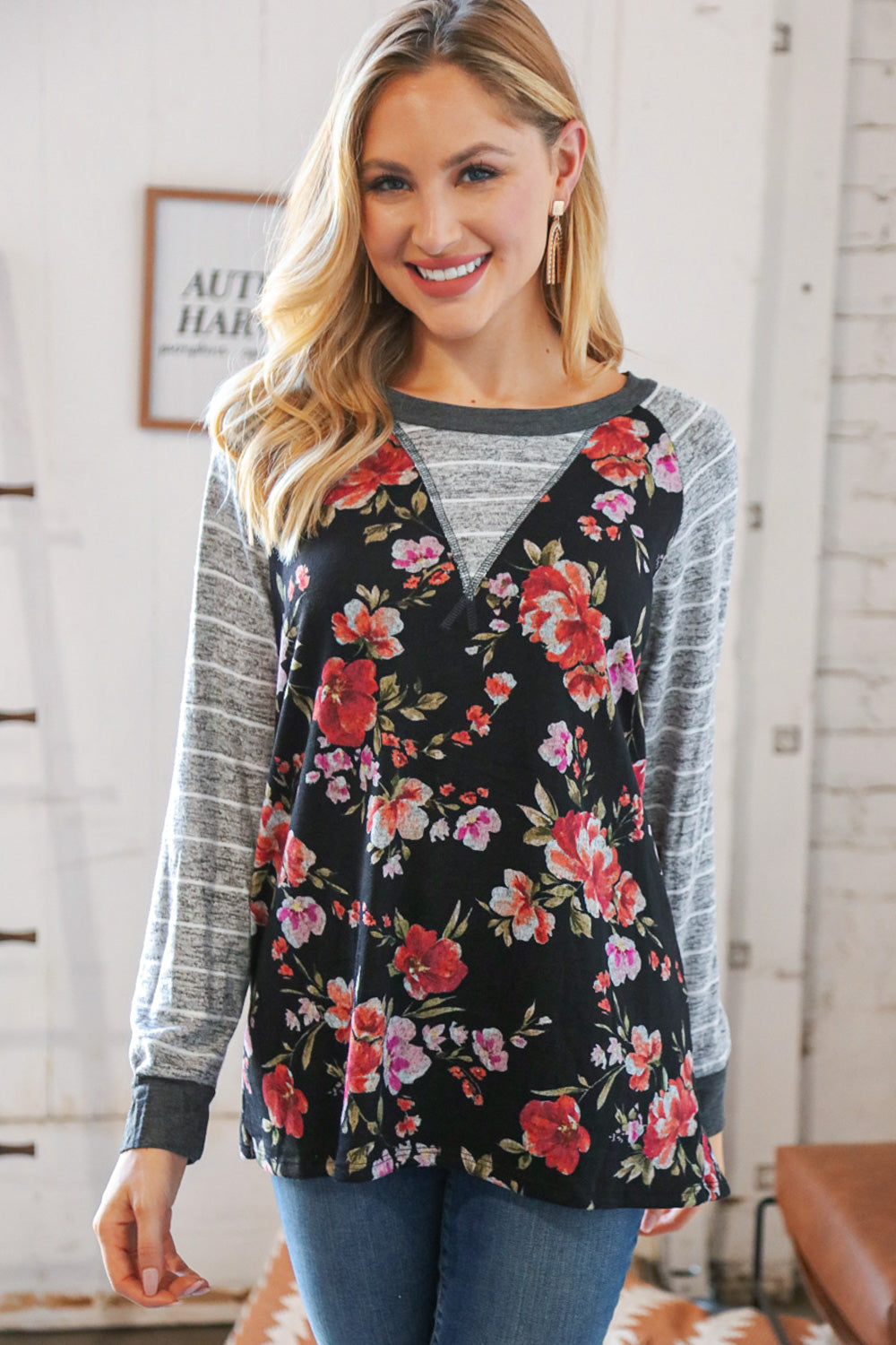 This long-sleeve color block top made with reverse stitch triangle details and contrast grey stripes is ideal for everyday wear. Designed with super soft black and floral Hacci fabric, this top is trendy and comfy.