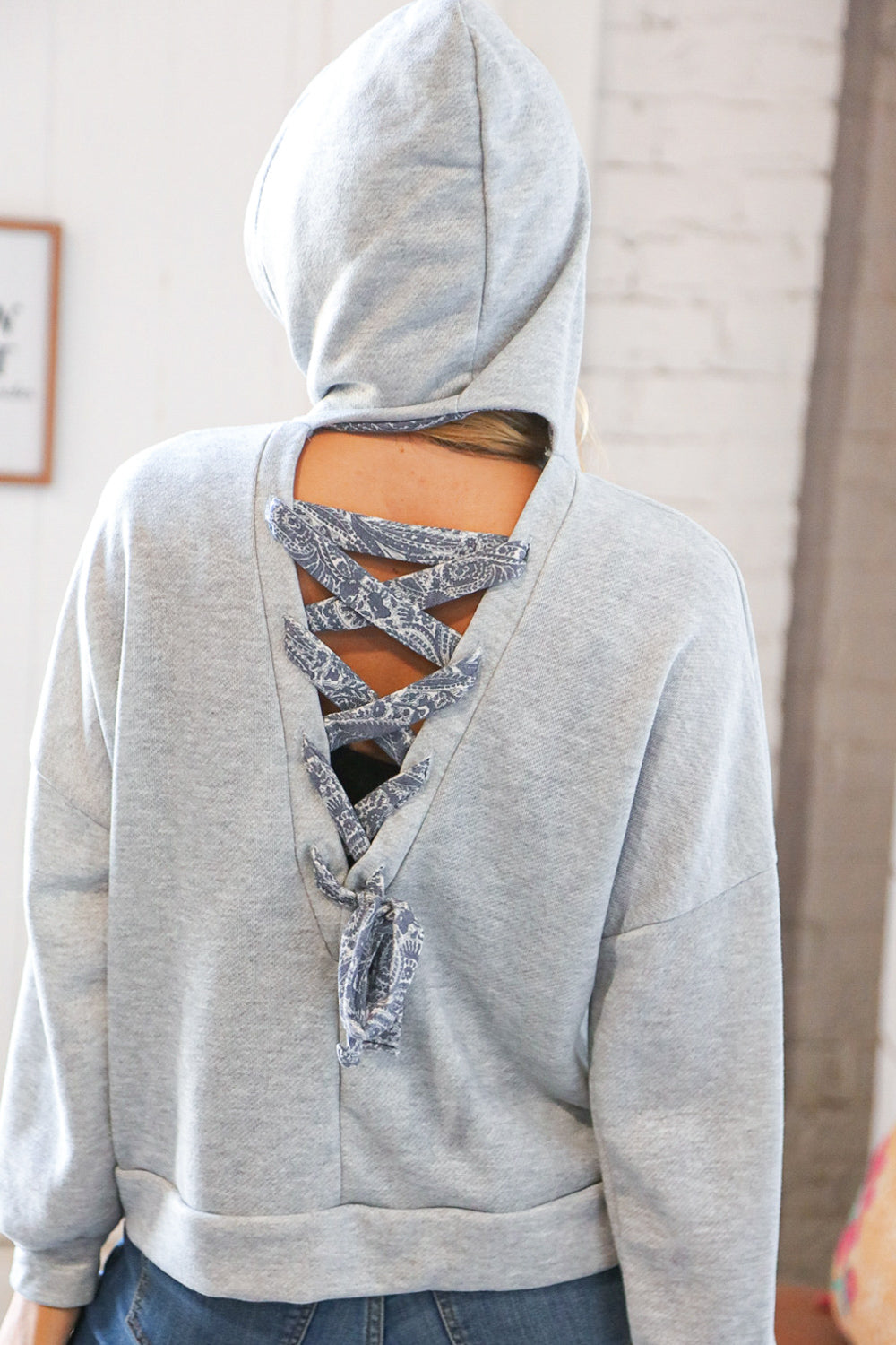 Grey Cotton Terry Paisley Sash Tie Back Hoodie