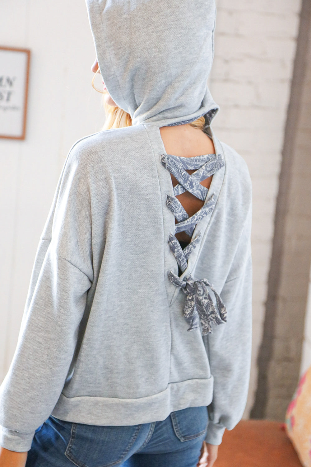 Made with a unique sash tied back design, this cotton blend terry paisley loose fit hoodie is a cut above the rest! Get effortless, playful styling with long bubble sleeves, a paisley lined hoodie with banded long sleeves and hem.