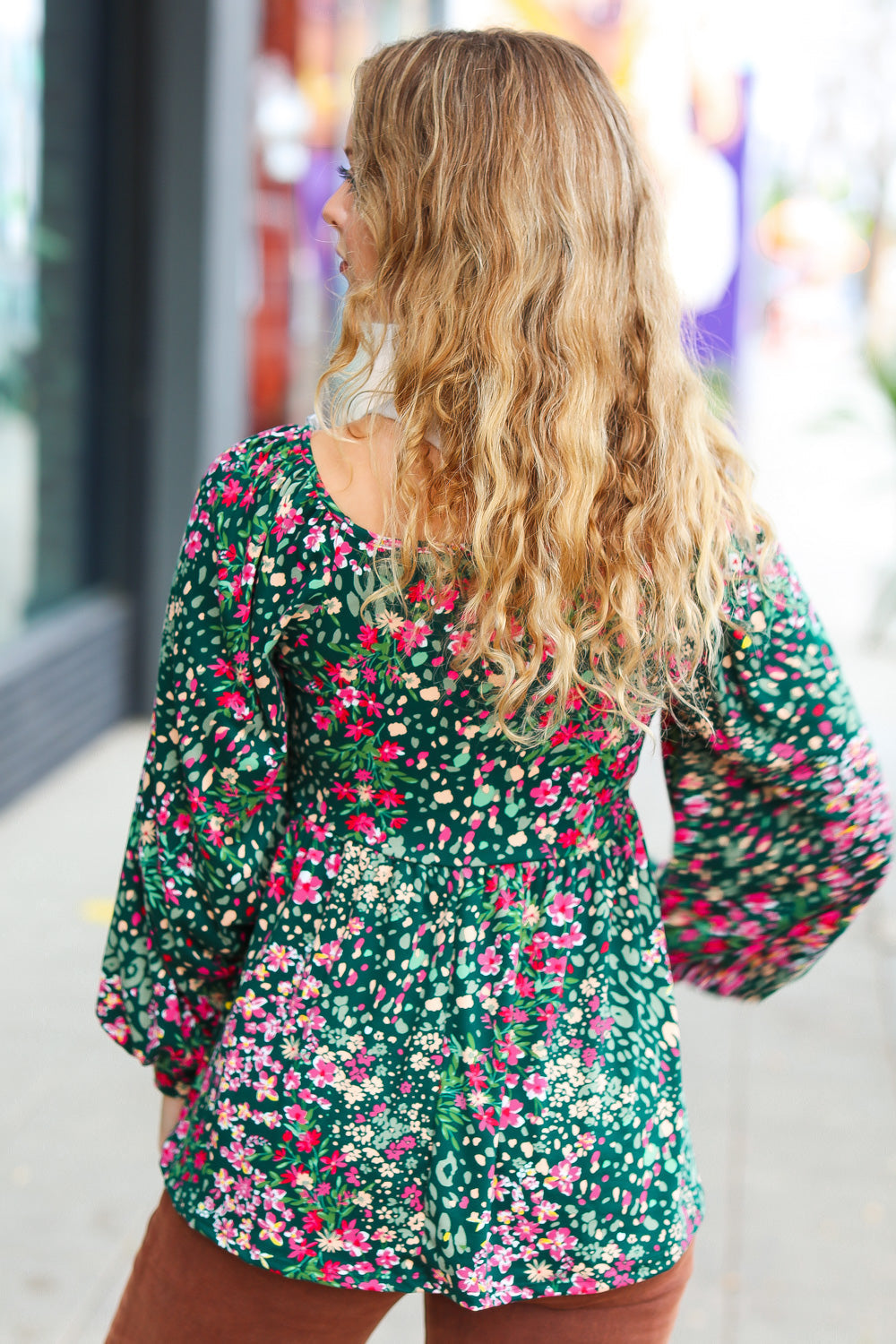 Slip on this flirty hunter green and fuchsia floral print baby doll top over jeans or leggings for an adorable look this fall. Keep it sweet with long bubble sleeves and a square neck.