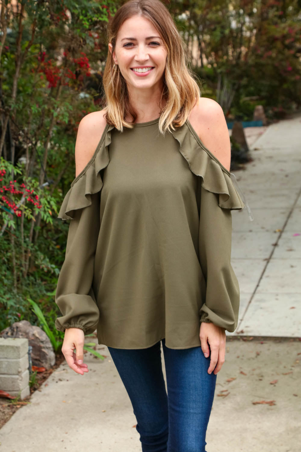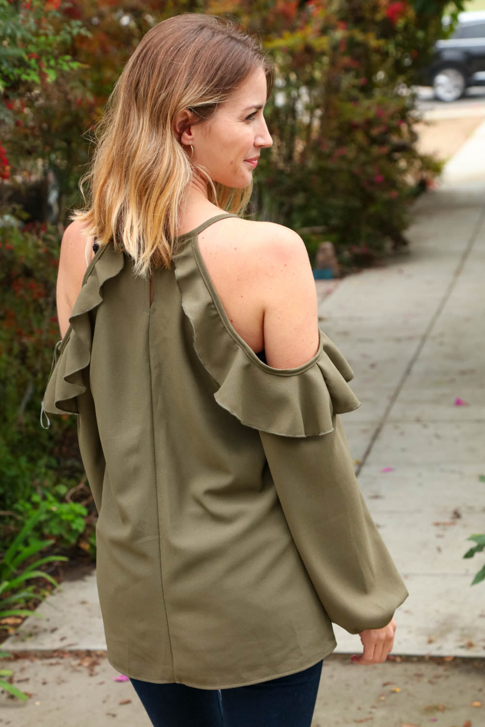 Hunter Green Halter Cold Shoulder Ruffle Woven Top
