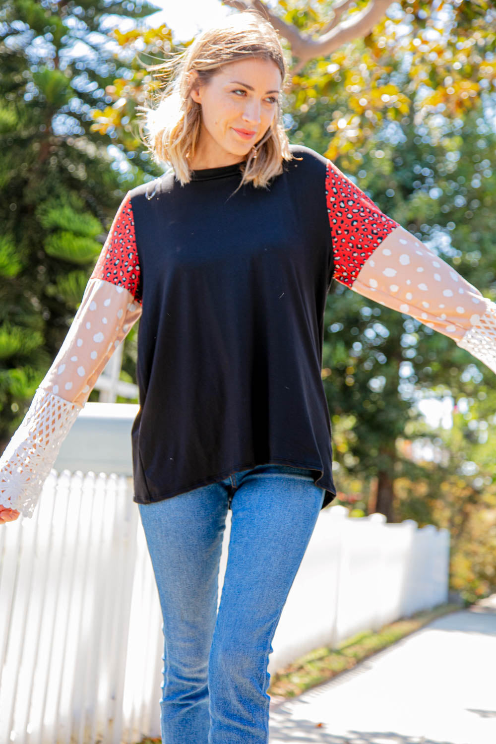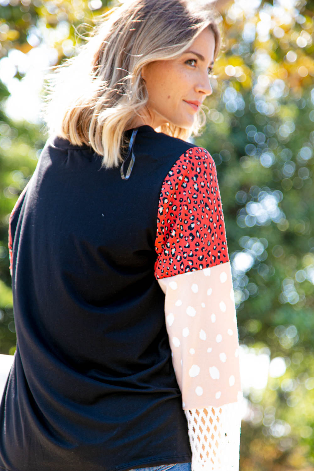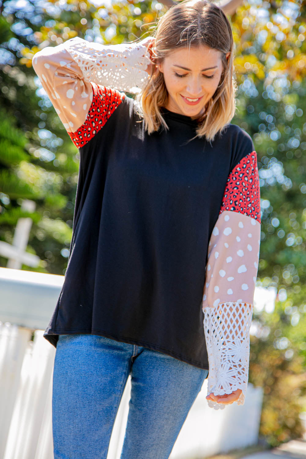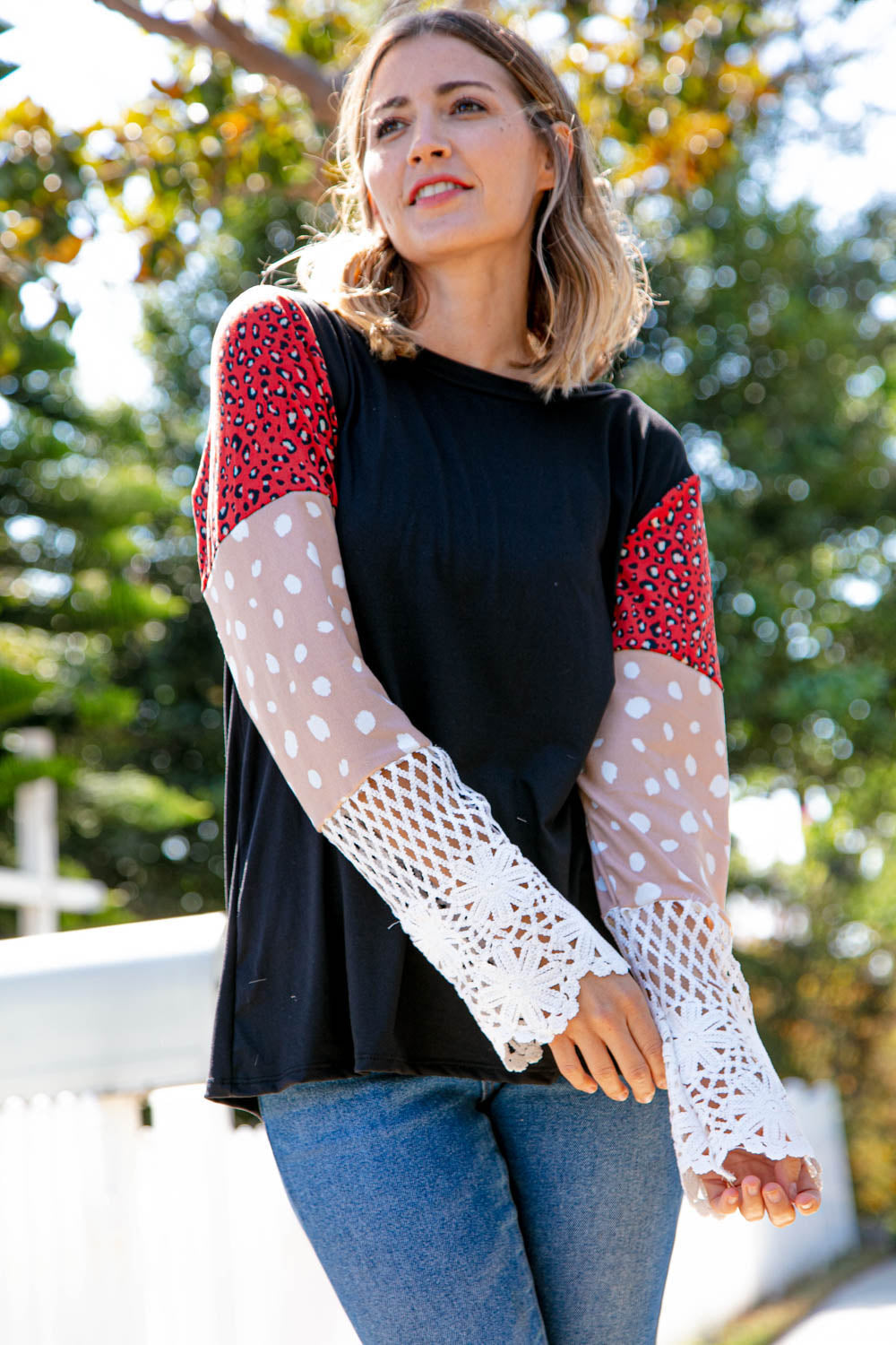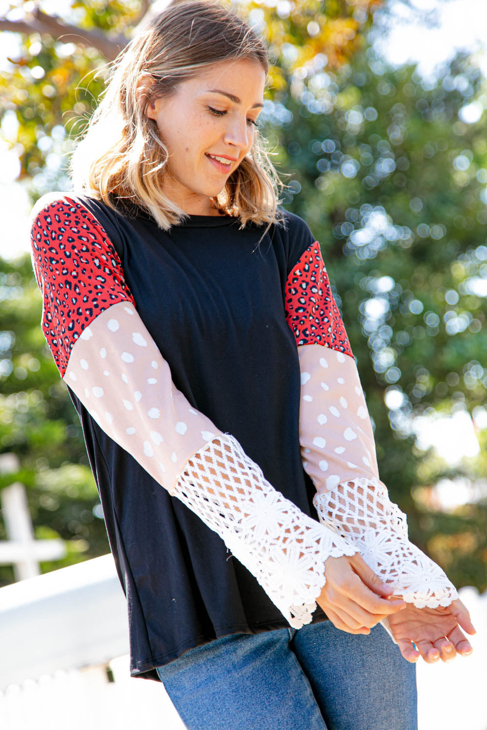 Leopard Color Block Lace Sleeve Knit Top