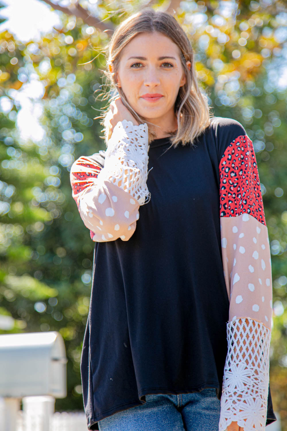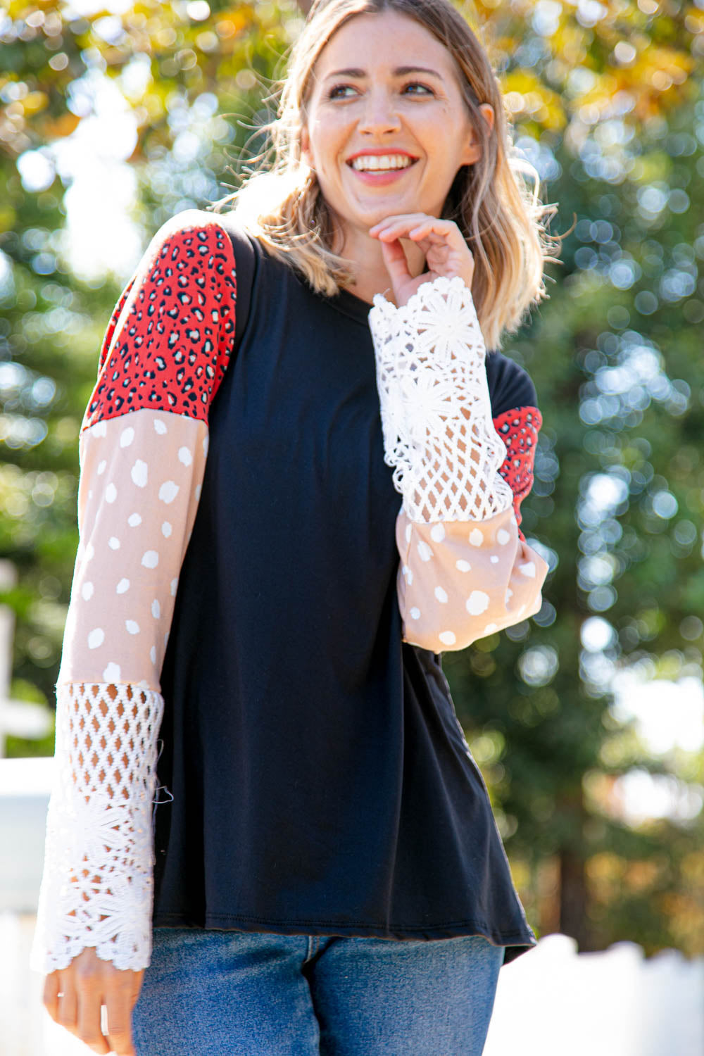 Glam up your casual wardrobe with this leopard color block top featuring buttery smooth fabric and long sleeves finished in beautiful lace. Pare with your fav skinny jeans.