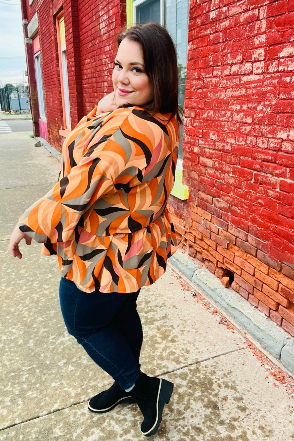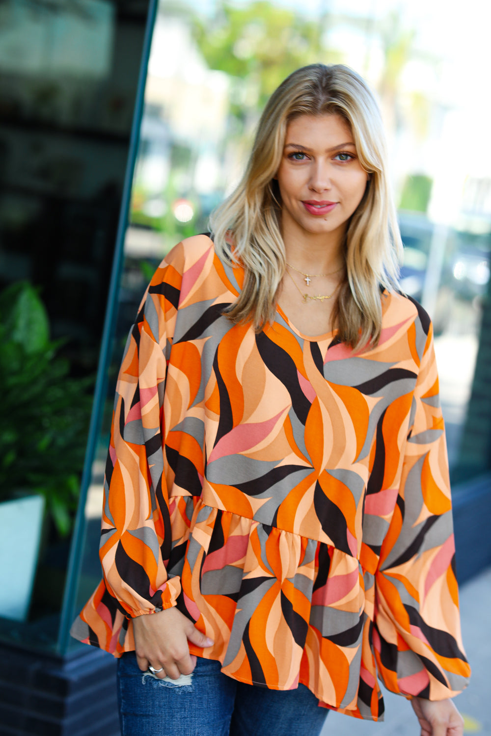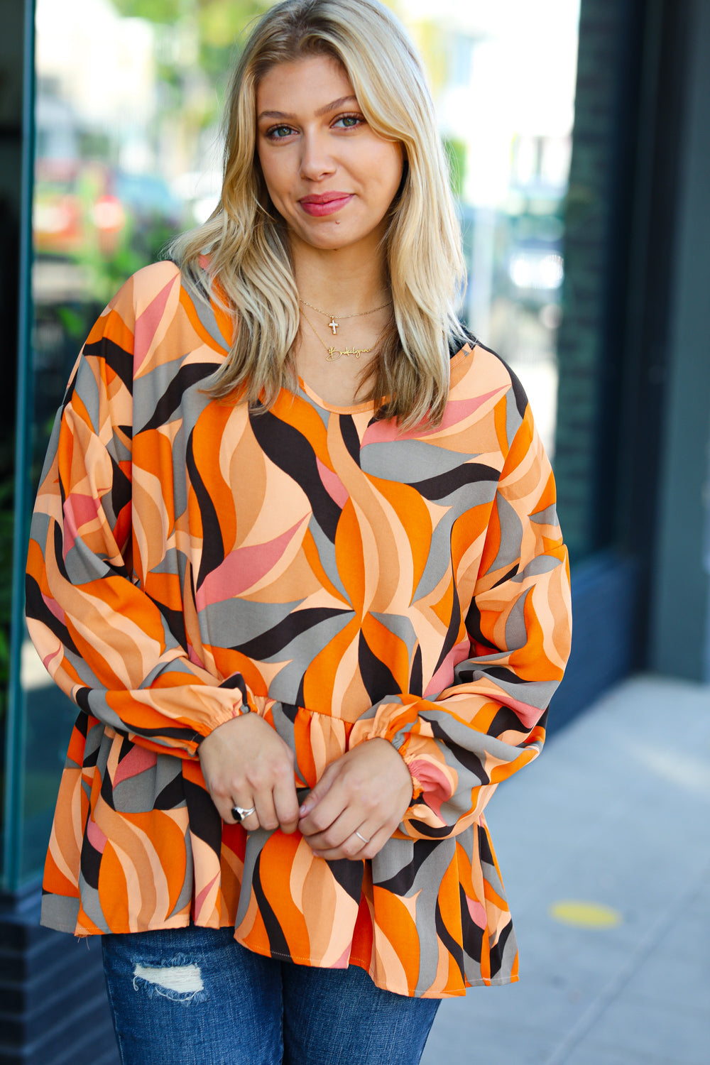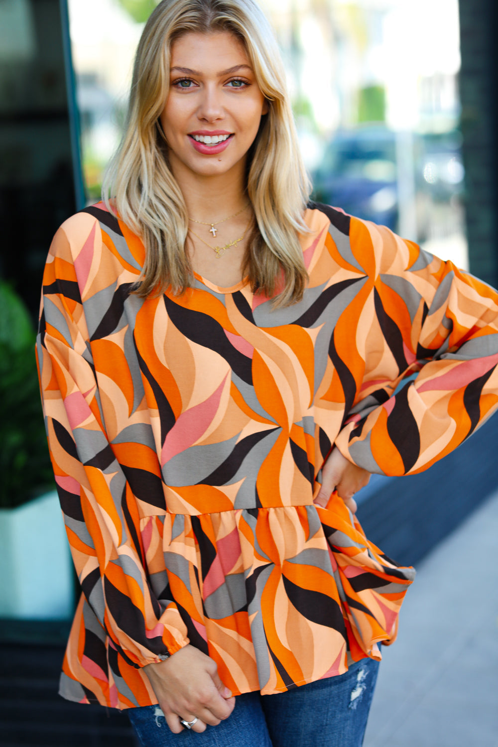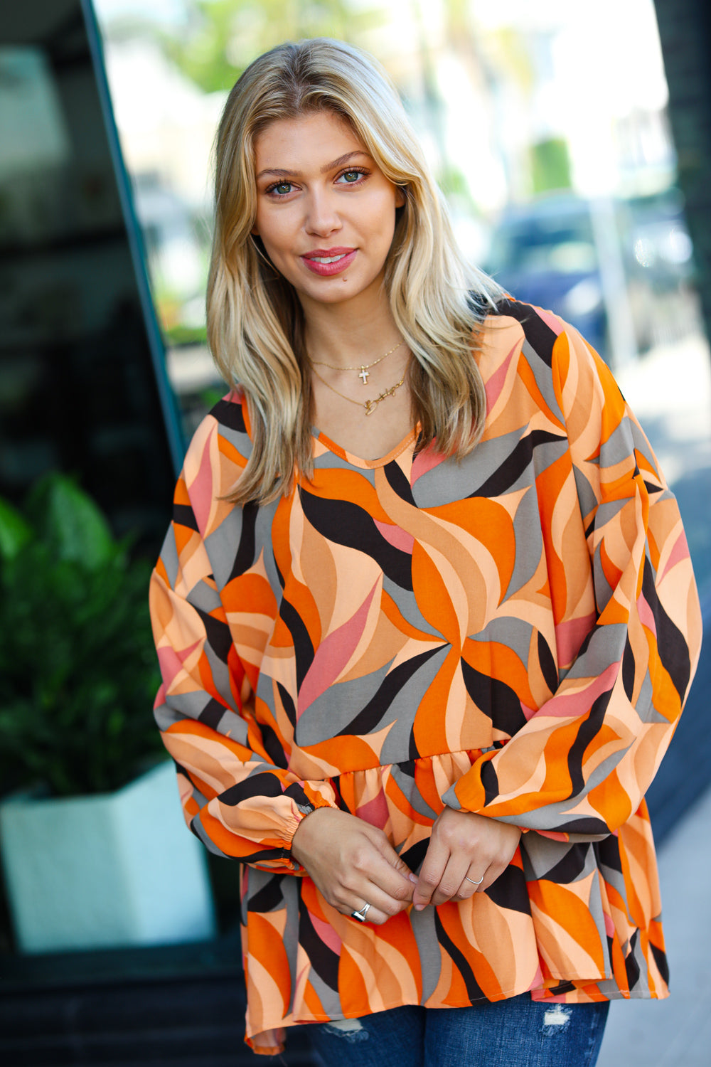 Lightweight and perfect for layering under cardigans or jackets, this rust and charcoal babydoll peplum top with abstract print has a V neck to showcase your fav accessories. Featuring long, elegant bubble sleeves, slip this top on for the office or a weekender!
