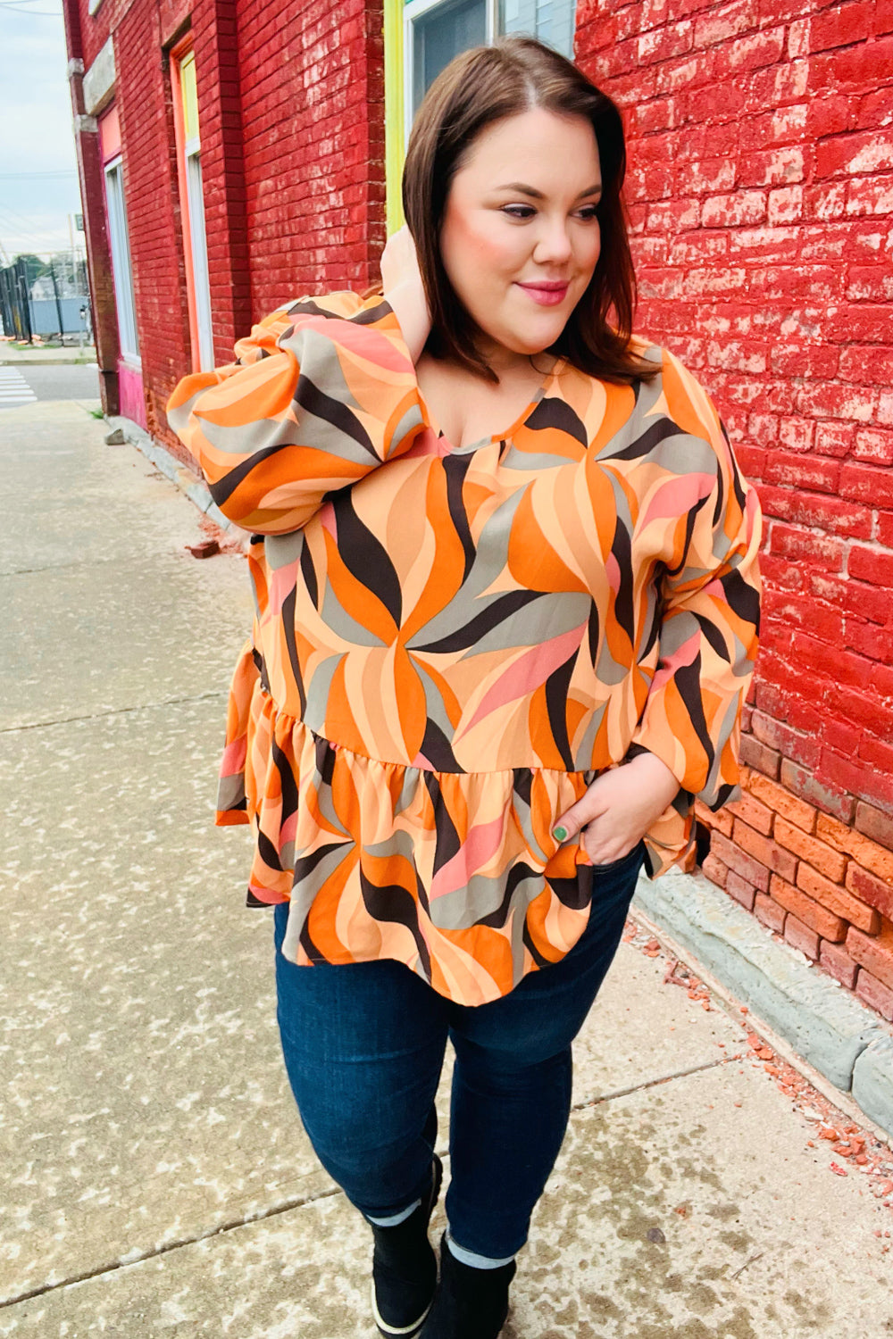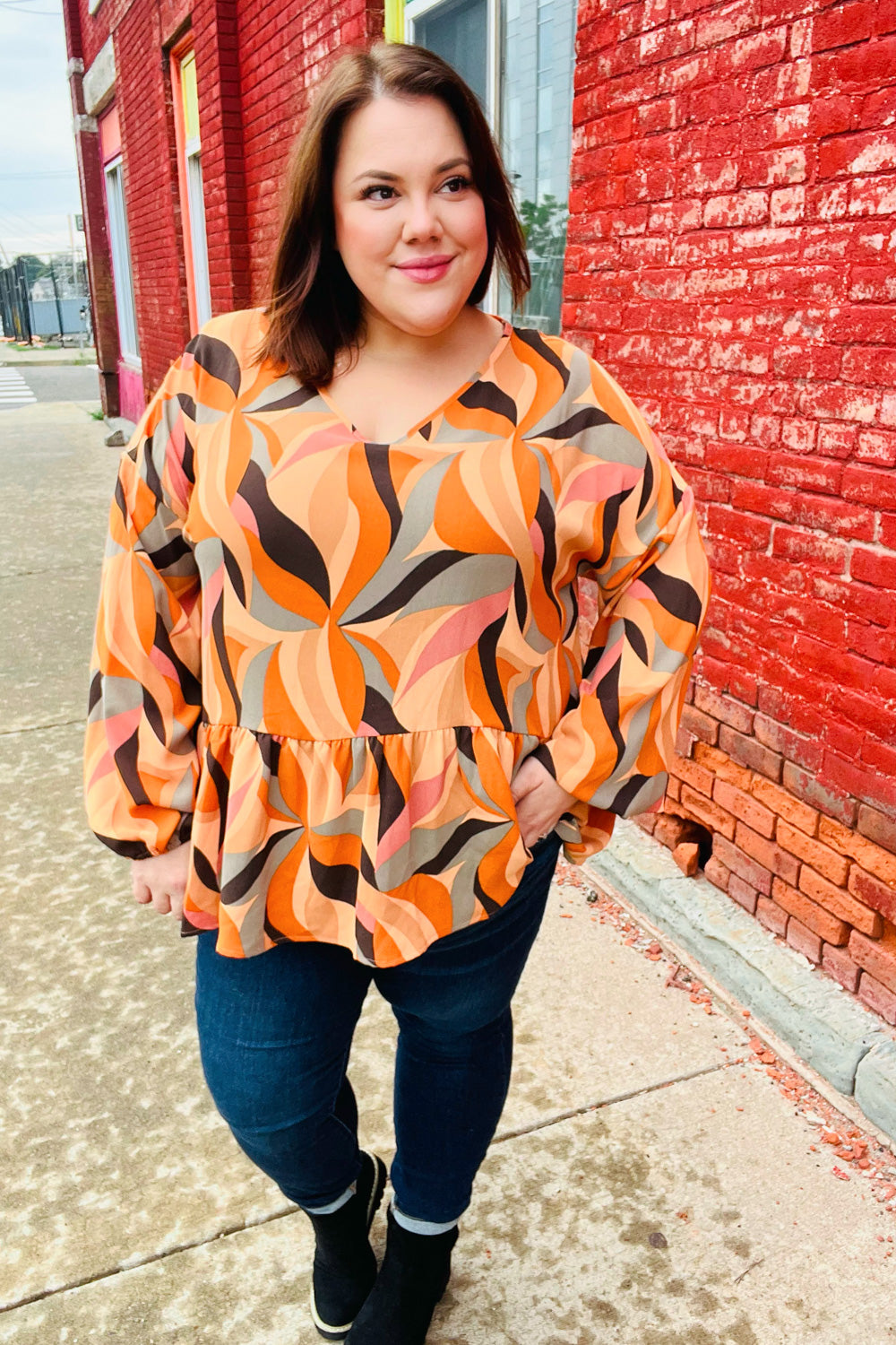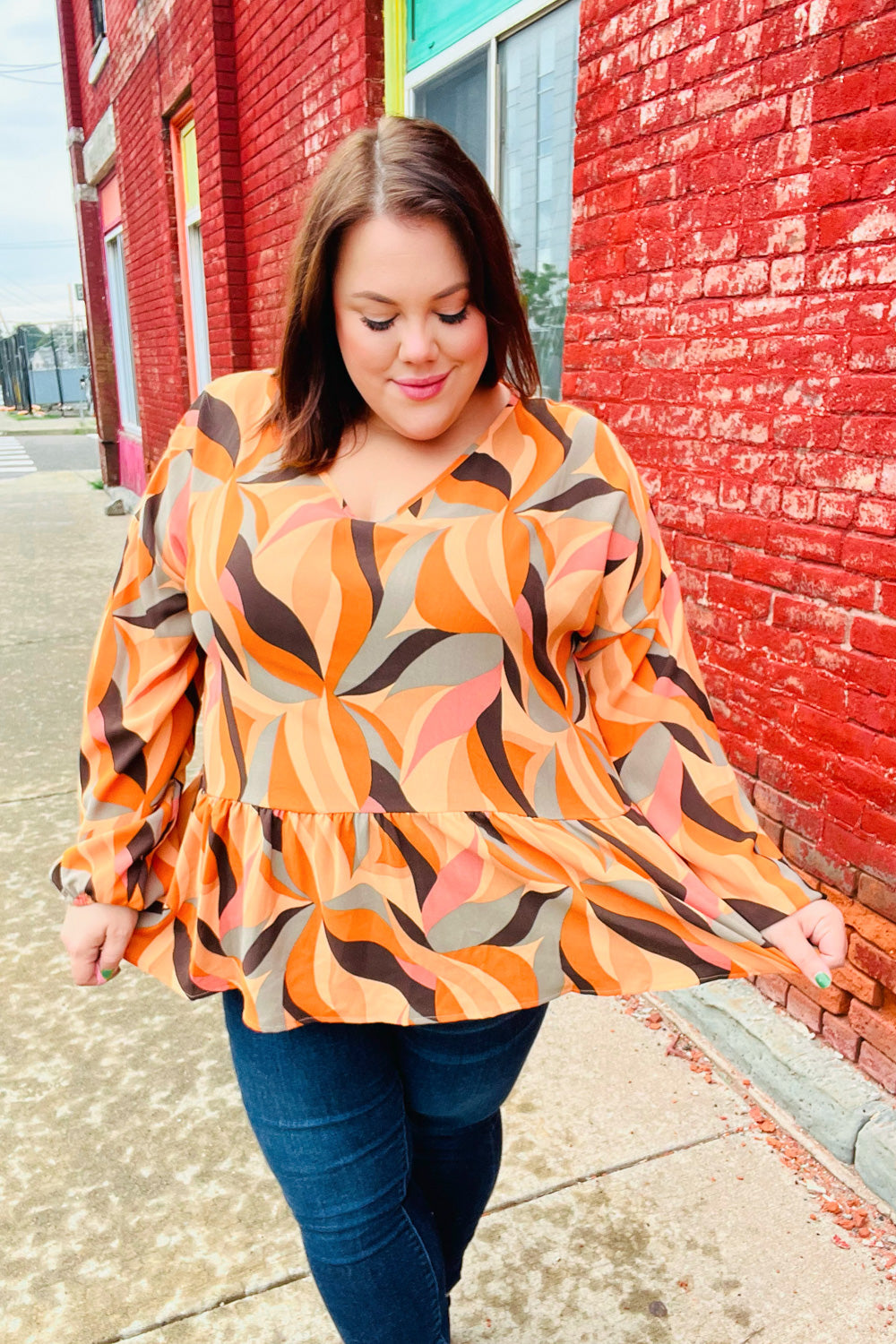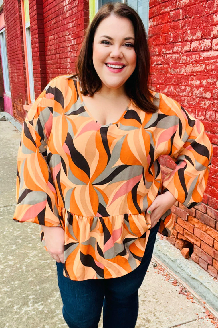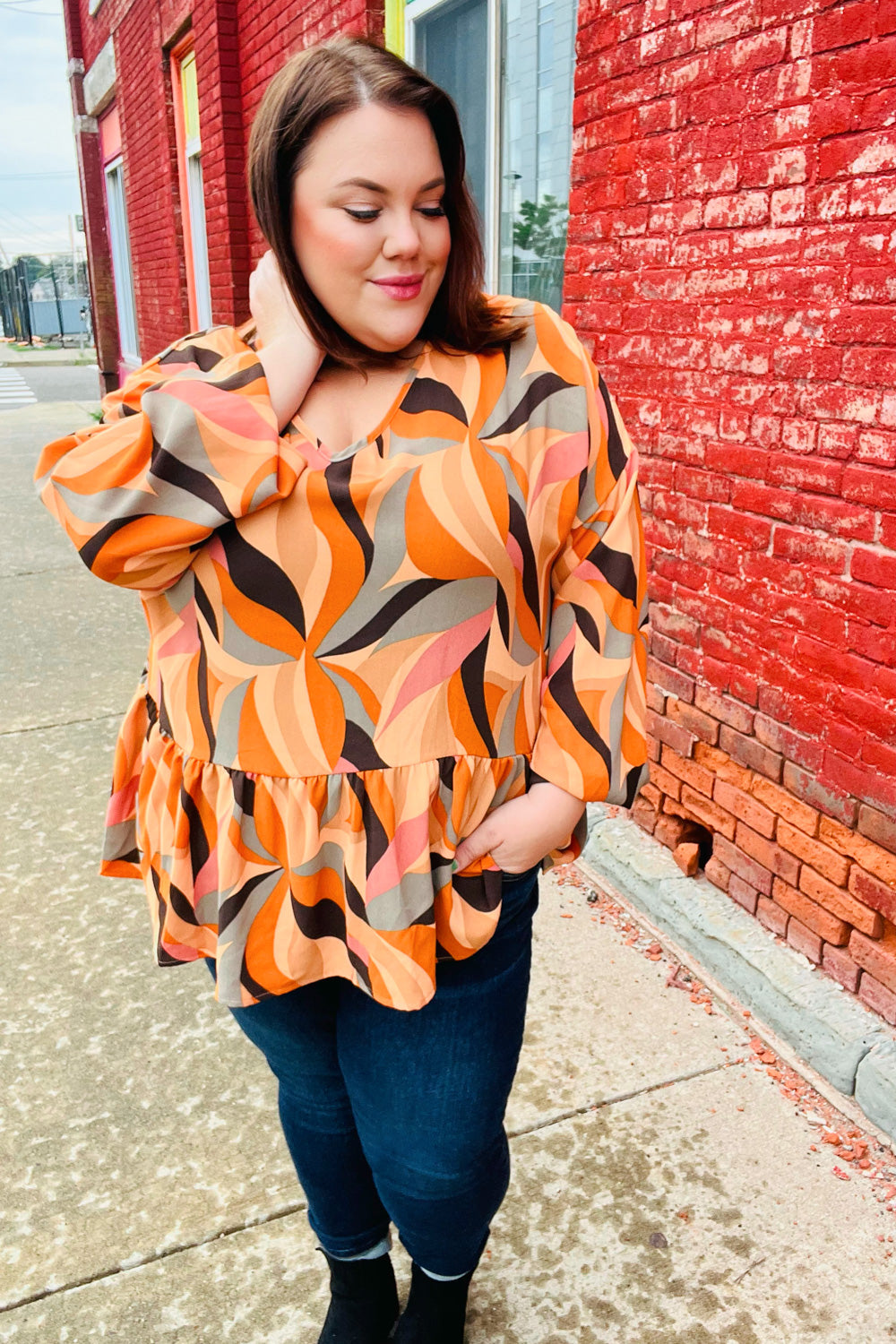 In My Thoughts Rust Abstract V Neck Peplum Top